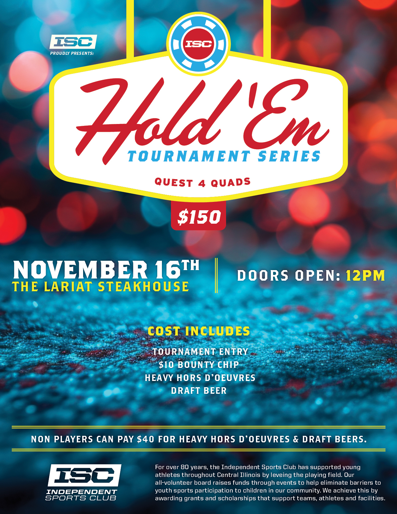 The Independent Sports Club of Central Illinois is hosting a Texas Hold’em Tournament on Sunday, November 16th, 2025 at the Lariat Steakhouse in Peoria.